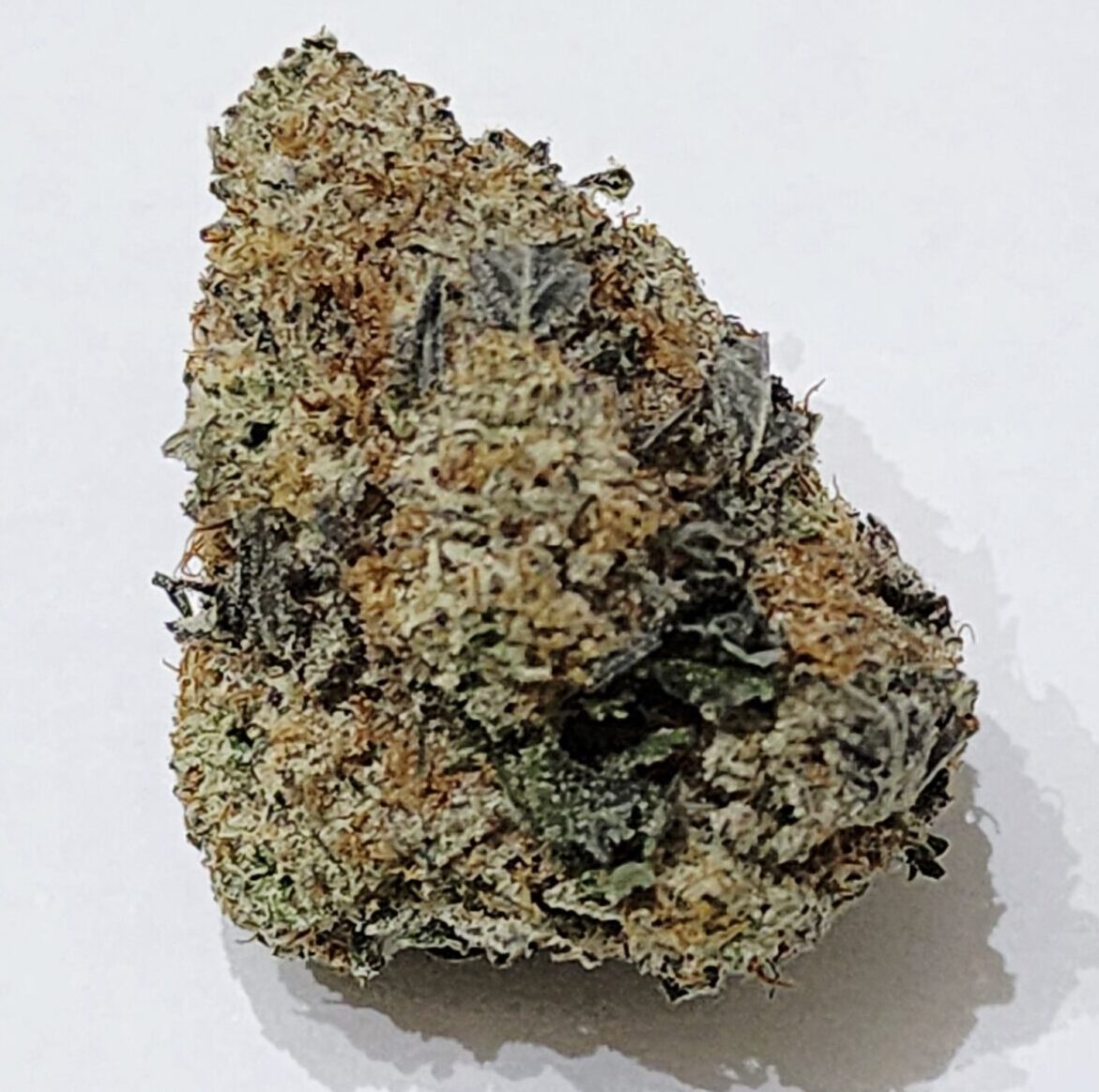 This bud has dense and rounded minty green nugs with bright purple undertones, sparse thin orange hairs and tiny white crystal trichomes.