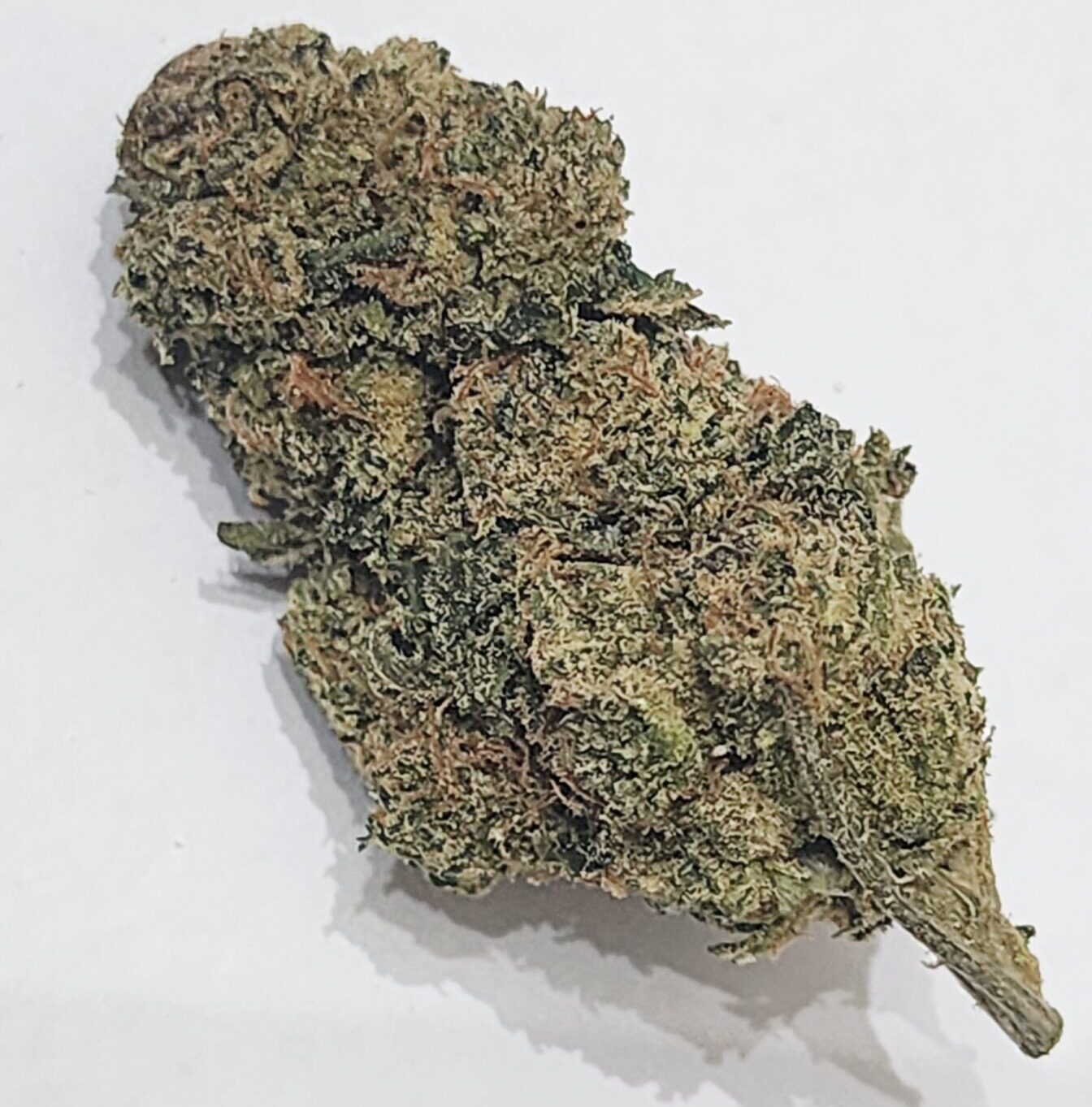 This bud has flat super dense oversized forest green nugs with lots of thin amber hairs and a coating of milky amber crystal trichomes.